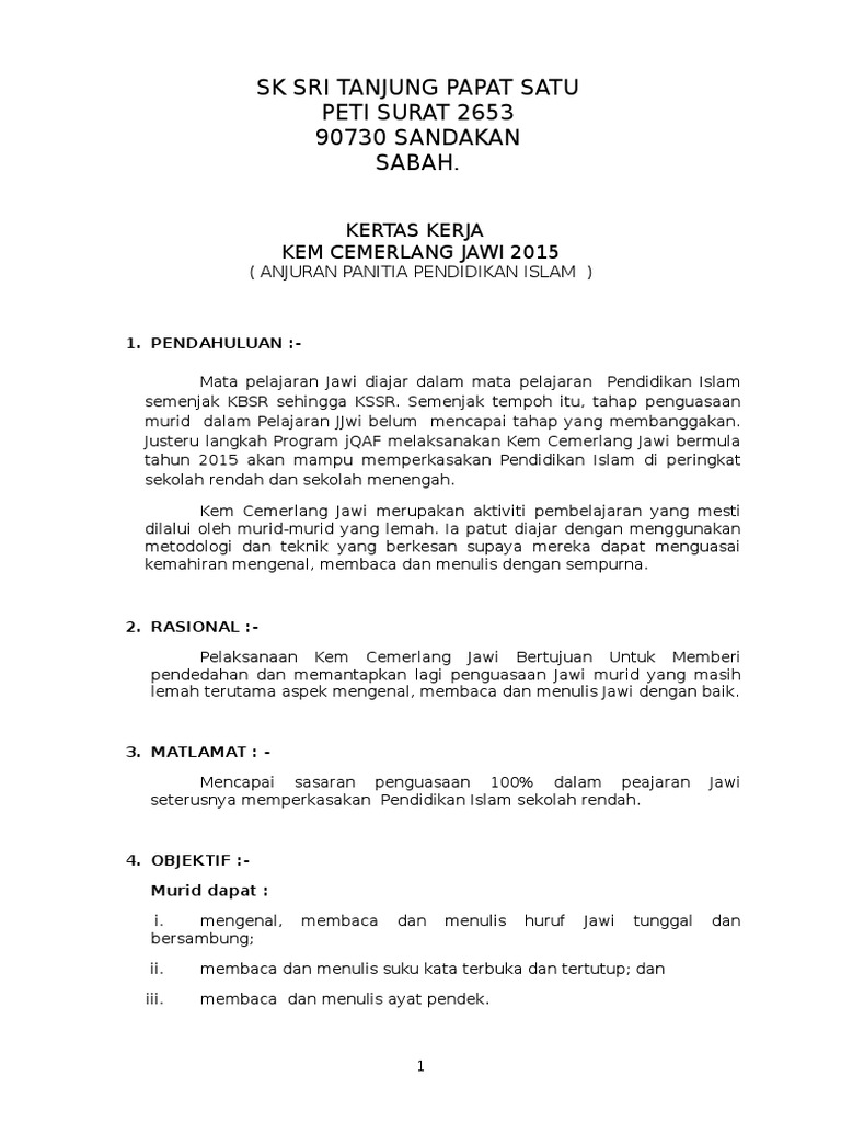 Langkah Program j-QAF mengadakan Kem Cemerlang Jawi KCJ bermula tahun 2015 akan mampu memperkasakan Pendidikan Islam di peringkat sekolah rendah dan sekolah menengah. KERTAS KERJA KEM CEMERLANG JAWI KCJ SK KAMPONG RAJA 2015 4. Interested in flipbooks about TESIS JAWI OUM 2019.
