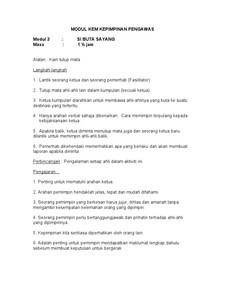 ADPU4334MODUL 1 13 Kepemimpinan sebagai konsep manajemen seperti dikemukakan Stogdill dapat dirumuskan ke dalam beberapa definisi tergantung dari mana titik tolak pemikirannya. Saya Mestilah Sentiasa Jujur dan Ikhlas Terhadap Diri Sendiri Objektif. Ketua kumpulan diarahkan untuk membawa ahli-ahlinya yang buta ke suatu destinasi.